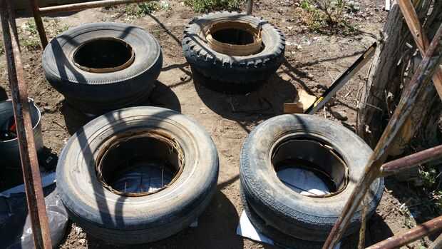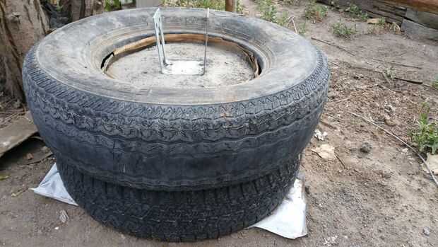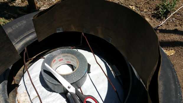 Ahora coloque con cuidado el segundo neumático en la parte superior el primer neumático para que el anillo de papel de alquitrán se ajusta dentro de la segunda rueda superior. Cortar las piezas de cartón a la misma altura del anillo de papel del alquitrán, que en este caso es de 5 pulgadas (127 mm). El cartón es naturalmente rígida tan rollo las piezas de cartón en un rodillo para formar previamente el cartón en un anillo.