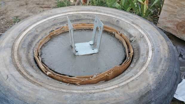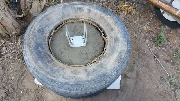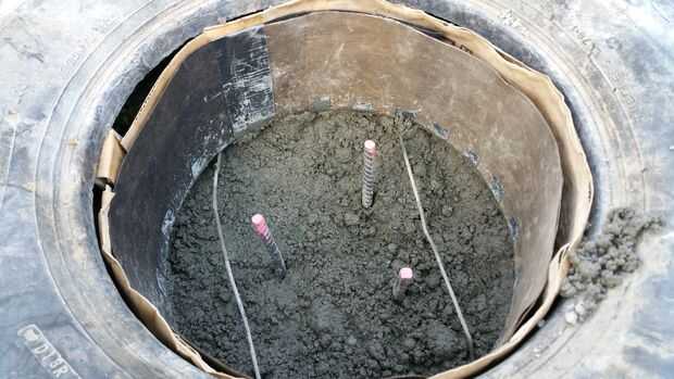 Continúe llenando la llanta inferior de hormigón hasta el grano del neumático. Luego inserte la varilla en forma de "L" para que el extremo largo está enterrado horizontalmente en el mojado de hormigón en el neumático por debajo con el extremo superior de la varilla expuesta y vertical como se ve en la foto 1. Barra de espacio 3 uniformemente en el hormigón.