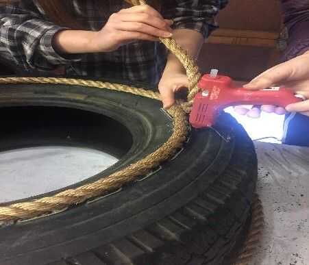 Aplicar el pegamento directamente a la rueda y colocar la cuerda en la cola. Continúe hasta que el neumático entero está cubierto de cuerda. Usar varias personas para este paso, si es posible.