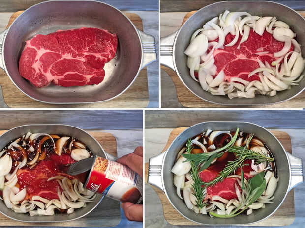 - Enjuague de estofado de mandril y colocar en la cacerola de la asación. Lávese las manos después de manipular carne cruda.