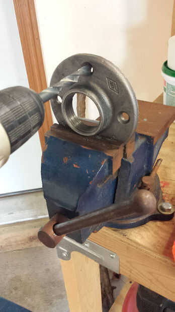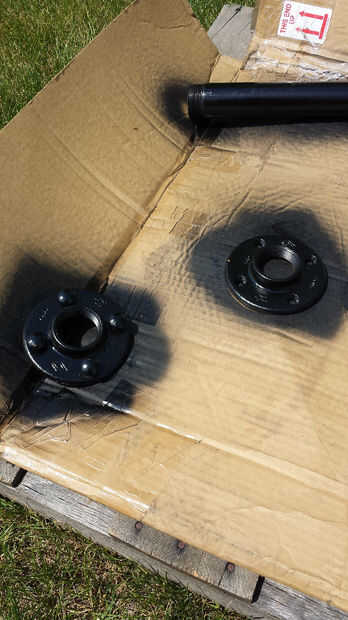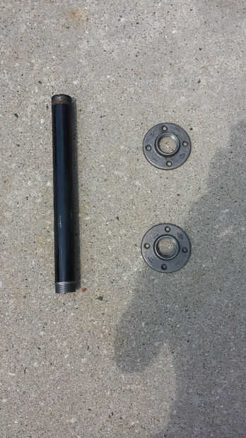 Todas las piezas que he encontrado en mi local Home Depot. El tubo negro había cortado y roscado allí. El reborde de la pipa que va montado en la base de madera no necesita más atención que estaría tomando apropiado 1/2" pernos. La brida que protegerá el borde a la tubería necesaria sus orificios perforados más grande para acomodar el mayor 5/8" ancho cabeza los pernos.