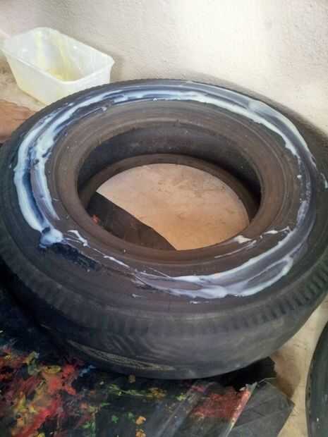 Ahora su pegamento de dos componentes de la mezcla y aplicar en el punto más alto donde se encuentran los neumáticos y coloque el otro neumático. Cola y pila hasta consiguen la altura deseada. 3 era justo para mí.