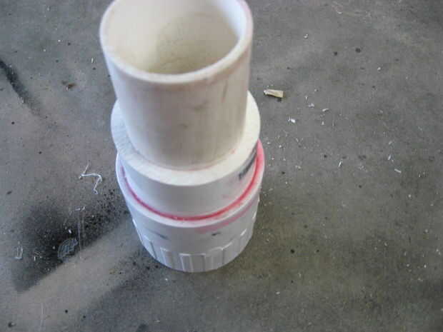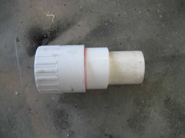 Haz dos de 50 x 40mm bujes PVC y corte 1cm del extremo de uno de ellos. Cortar un trozo de tubo de PVC de 40mm 15cm de largo y la soldadura solvente de uno de los bujes hasta el final y el otro buje justo por encima de la otra. Luego solvente suelde el adaptador de enchufe hembra en el buje en el extremo de la tubería. Un buje debe quedar dentro del adaptador y la otra justo por encima de él.