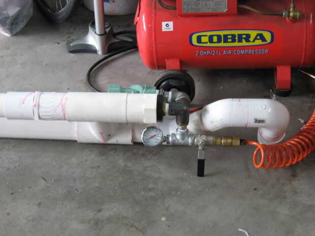 Ahora el hilo de rosca del adaptador macho 2" roscado con acoplador y el 2" del barril gracias al apoyo del cañón y estamos listos. Si desea utilizar la pelota de golf barril solo rosca en el otro adaptador con el acoplador de 1/5" y el cañón de la pelota de golf a través de la tubería de 2" para mantener estable la manga. Así que no tienes que tomar 2" de cañón.