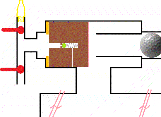 Una vez que eliminas el aire detrás del pistón agotando el volumen experimental (área detrás del pistón) con la válvula del aspersor (que permite el volumen piloto hacia fuera en la atmósfera) el medio en la parte posterior del pistón empuja hacia adelante, se ha ido. Ahora es sólo una fuerza que actúa en el frente, empujando el pistón hacia atrás. El pistón es enviado a velocidades increíbles en una fracción de segundo en el 'tope' que reduce el impacto. Ahora el asiento está abierta y la presión de aire de los flujos de la cámara en ella y hacia fuera en el cañón que lanza el proyectil. Esto ocurre en una fracción de segundo y es generalmente bastante fuerte.
