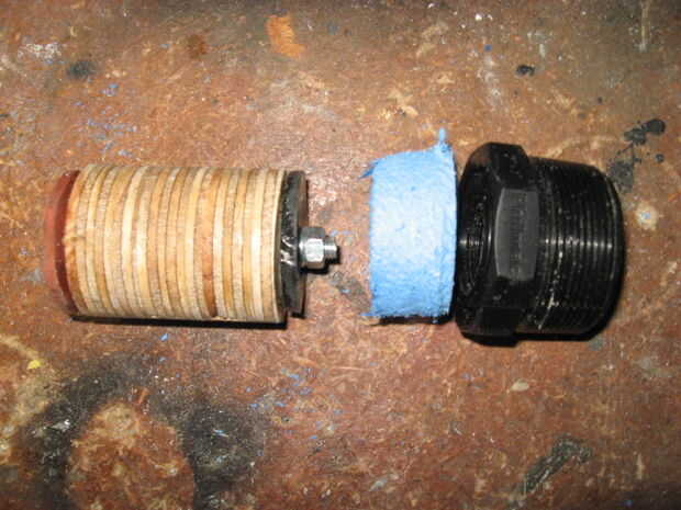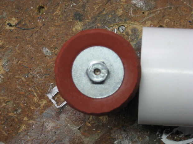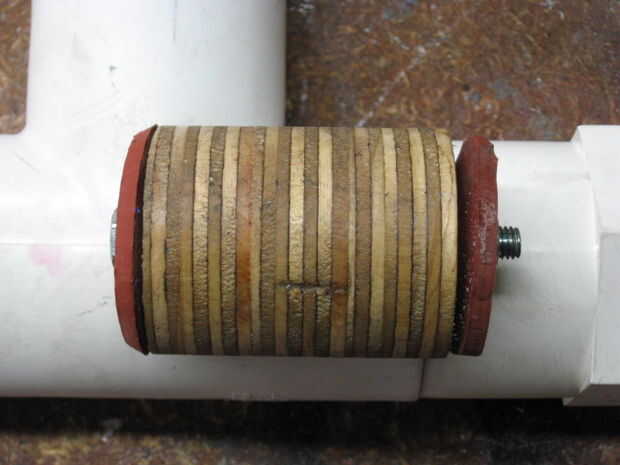 De todos modos, pulir el pistón de madera por lo que cabe cómodamente dentro de la pipa del PVC de 50mm y se puede empujar con el dedo. Pero asegúrese de que no hay espacio en el exterior del pistón, el ajuste más apretado mejor. El perno de corte cricle de neopreno (caucho) del mismo diámetro que el pistón. Generalmente puede encontrar discos de neopreno en HomkeDepot. Esta es la cara del lacre