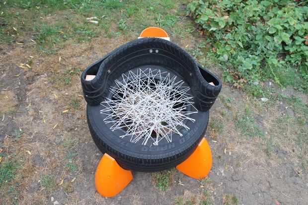 Girar un par de viejos neumáticos de una silla de estilo industrial de interior y al aire libre. La base de naranja y los pies son opcionales. No te olvides de pila de su otro junker del neumático por debajo de la silla de la cadena para hacer una altura de asiento modificado para requisitos particulares para usted.