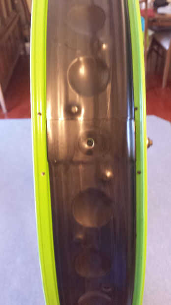 El primer paso es quitar la llanta y el tubo dentro de usted se dará cuenta de la tira de borde protector/decorativo encontrado en las bicis de grasa neumático con bordes perforados. Salí de mina como es pero mucha gente como quitar esto y reemplazarlo con alguna cinta decorativa. También se puede ver lo que inspiró mi para empezar este método, los orificios de ventilación de 8, 4 alrededor del vástago de válvula y 4 enfrente de eso donde está la costura del borde. Creo que estos están perforados en los bordes para ventilar los gases cuando la llanta se sueldan con autógena juntos, pero puedo equivocarme en esto.