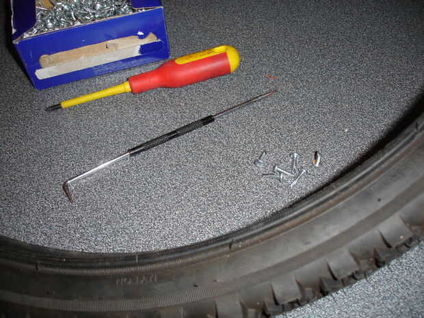 La lista de piezas para este proyecto era muy simple y todo lo que tenía en los estantes: 2 neumáticos (neumáticos) 200 tornillos cola vieja llanta herramientas punzón (u otro agujero haciendo dispositivo - sí utilicé un escribano) destornillador