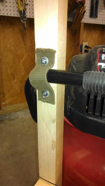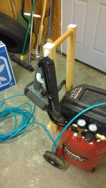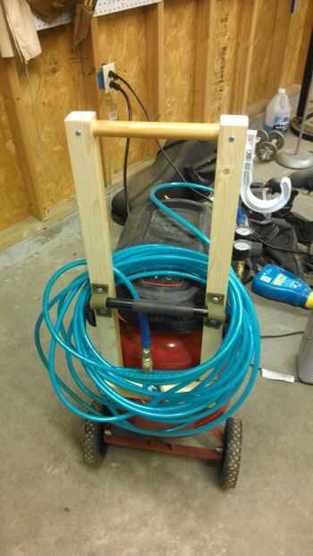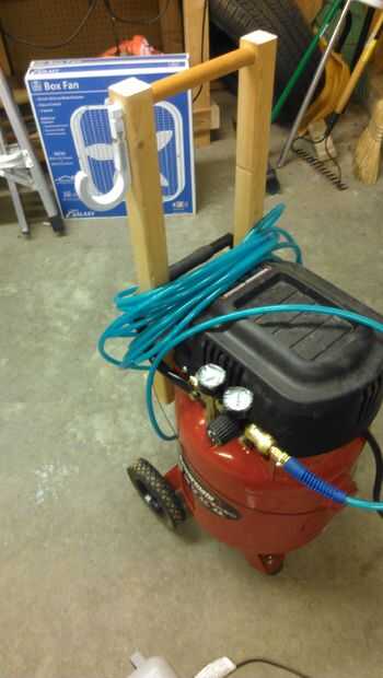 Por lo tanto, Dónde está el problema?"preguntarás. Bueno, la máquina es apenas bajo 2 pies 6 en altura. Estoy 6'1 ". Además, el mango no estaba cerca lo suficiente para guardar la manguera de 50'. Así, he conseguido un mango más largo fuera material de desecho que no cambia permanentemente el compresor de la moda. Incluso puse un gancho que gira sobre un eje que sostenga una pistola de clavos.
