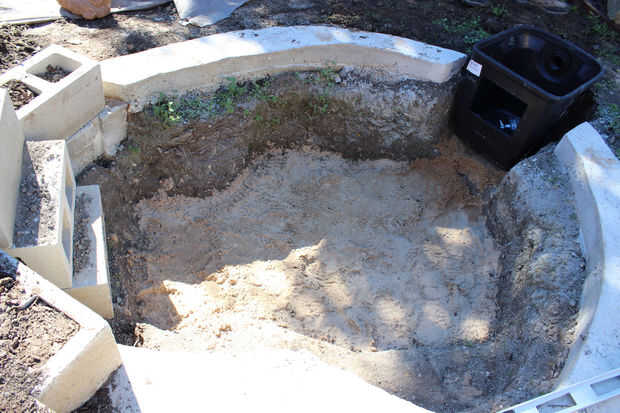 Inicio de su fundación en roca. He utilizado hormigón y bloques de hormigón por ubicación del estanque en una zona que era propensa a la erosión del suelo. Queríamos para asegurarse de que el estanque no se conformaría o escaleras shrink.we construida para la caída del agua que también utilizamos el acolchado de la alfombra y un contrapiso para amortiguar la funda de goma de cement.don't olvidan la arena. empezar a añadir microfall y skimmer. 25 pies del 1/12 pulgada tubo de PVC. y a plomo. nivel de las cataratas. es muy importante. ahora si la adición de luces ahora es el momento.