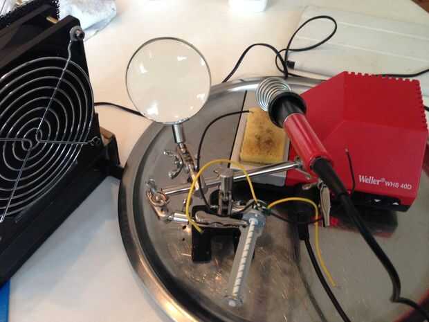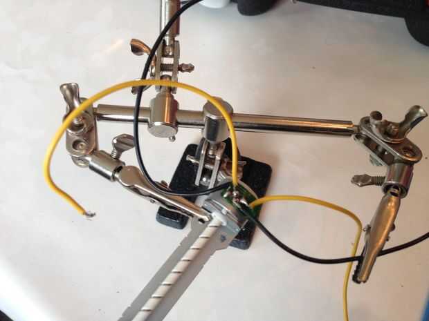 Individual de los motores paso a paso de los caddies de tracción. Ponga uno en mi 3 º mano quijada de cocodrilo y desoldar las cuatro clavijas. A continuación, utiliza la segunda mandíbula de cocodrilo para sostener el cable y alineados de tal manera, que no tengo que controlar manualmente también. Lo que significa podría enfocarse en controlar mi soldador y estaño.