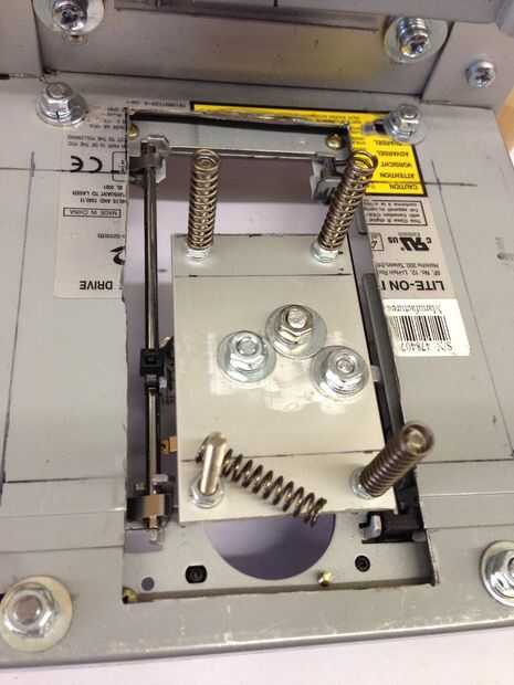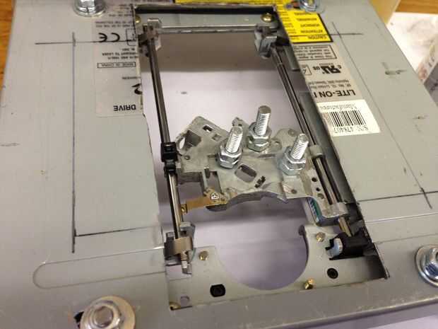 Como con el otro eje he aplanado la cama DVD, 3 x 4mm agujeros perforados y adjunto algunos tornillos de 4mm a la cama con unas tuercas. Estas funciones las tuercas como separadores hasta la placa de aluminio que funciona como la parte inferior de la cama calentada.