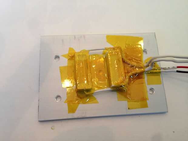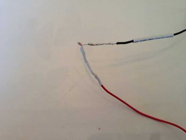 Fila hasta mutuamente, poner algunos termoencogibles en las "patas" expuestas entre los dos - para evitar cortocircuitos si tocaron la cama calentada. Luego envuelve las piernas superpuestas alrededor de la otra y los soldados juntos.