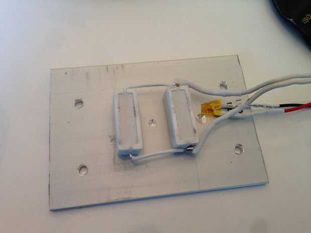 La placa de aluminio es 4cm de ancho y 75 mm de largo con un agujero de 3mm perforado cerca de cada esquina. Asegúrese de que tener espacio debajo de la placa de la cabeza del perno de 3mm que vas a utilizar en cada esquina. Había extendido mi cama climatizada más hacia afuera, de modo que no está totalmente centrado.