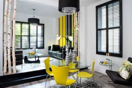 Después de pintar todo nítido blanco (como un telón de fondo de galería para las piezas del Museo de diseño que seguiría poco), acentúa con bandas de látex vivas amarillas y negras. Perseguir más lejos la sensación de la galería de arte, se utilizó el negro más profundo de los marcos de ventanas y rodapiés, que efectivamente nuestro proyecto.