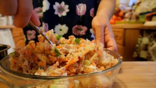 En un tazón grande, mezcla de carne de cerdo picada con harina seguida por la mezcla de la salsa hasta que estén bien cubiertas. Poco a poco añadir las gambas, carne de cangrejo, castaña de agua, zanahoria y cebolleta y mezclar bien. Reservar para más tarde.