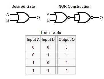 Una puerta de XNOR se puede construir de cuatro puertas ni implementar la expresión "(A NOR N) (B ni la N) donde N = A ni B". Esta construcción tiene una propagación la de una sola puerta NOR retrasar tres veces y utiliza más puertas.