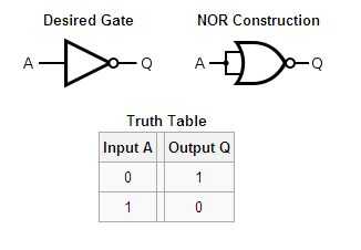 Esto se hace uniendo las entradas de una puerta NOR. Como una puerta NOR es equivalente a una puerta OR lo que no cancela, esto automáticamente ve a la parte "O" de la puerta NOR, eliminarlo de una consideración y dejando sólo la parte no.