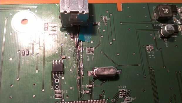 6. ahora puede soldar a cable de parche en su sitio. Tuve que hacer esto con 3 de las 4 huellas y logró que finalmente trabajando sólidamente! Ver cómo chunga mina pero funciona bien! Este fue mi primer intento así que era ensayo y error (y un montón de googlear) pero trabajó un convite!