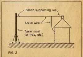 El primer diagrama muestra una instalación de cable de antena típica. Saliendo de una ventana, el cable está anclado al edificio y luego a cierta distancia (10 m +) a un árbol cercano u otro edificio.