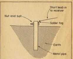 El cable de tierra sale la misma ventana y anclado en un tubo de metal/agua o metal estaca, incrustada en el suelo blando y húmedo.