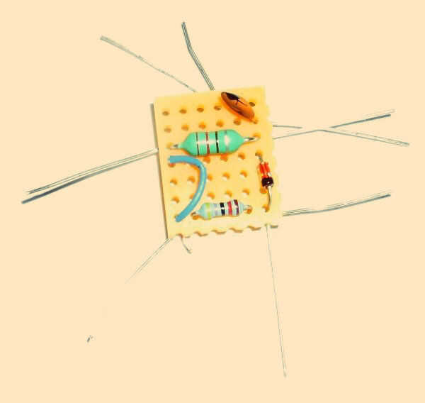 3. luego tomar el diodo, capacitor y resistor y colocarlos en los lugares que se muestra, asegurándose de que la banda de color en un extremo del diodo se une con el cable resistor, como se muestra