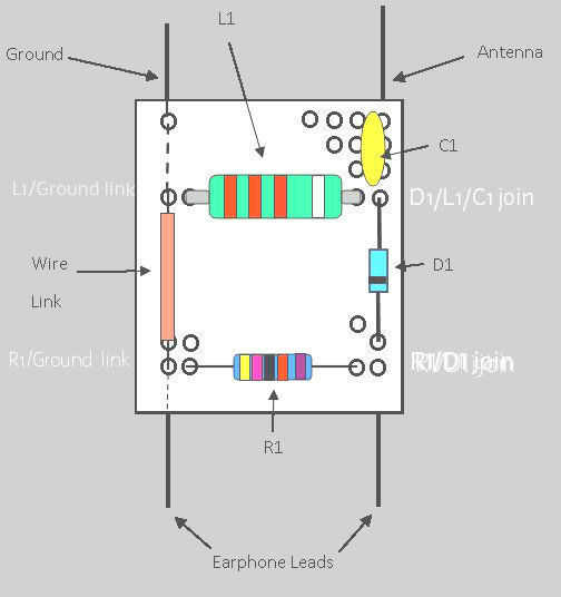 7. por último, el aislante de ambos extremos de los cables mucho diverso color de 60mm de la tira y sujete a la Junta de la matriz - uno va hasta la Unión de cable de enlace/inductor y este será el cable de conexión a tierra. Coloque el otro en el extremo libre del condensador C1 y se trata de la conexión del cable de antena. Ambas conexiones se realizan debajo de la matriz. La Radio de cristal de Nic Nac Tic Tac está lista para la prueba.