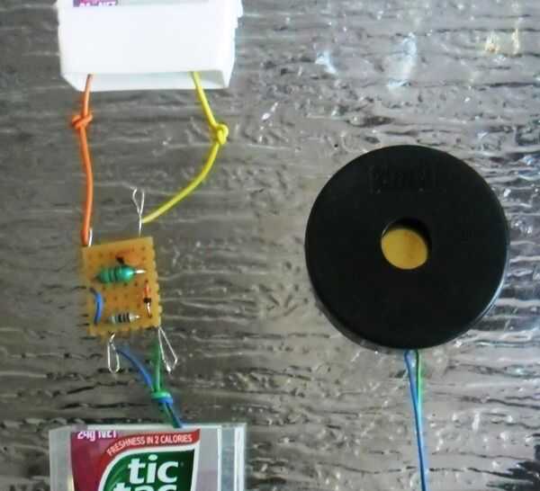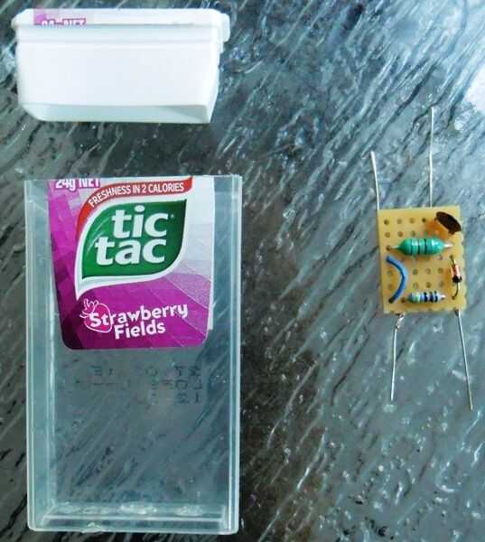 Cuando haya terminado de construir el circuito de tablero matriz y han recortado todo el componente de exceso conduce, punción 3 tres agujeros en la caja de Tic Tac - 2 pequeños agujeros en la tapa de la caja, de aproximadamente una pulgada (24 mm), para que el cable de antena y tierra lleva pueden venir a través de la tapa de la caja y conectados a la placa de la matriz en los puntos 2.