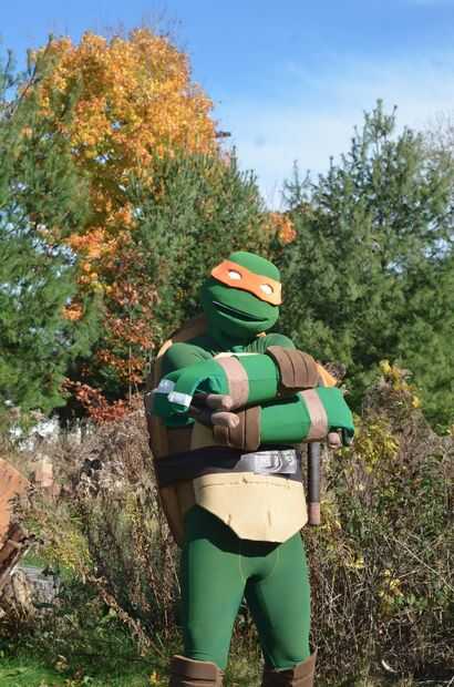 He creado Raph primero (ese soy yo) y sus patrones para crear los otros tres. Cada tortuga es un poco diferente pero la idea sigue siendo la misma para todos. Resultó gran. Lo bueno es que puedo tener personas de diferentes tamaños en el mismo vestuario y los trajes de ajustan muy bien.
