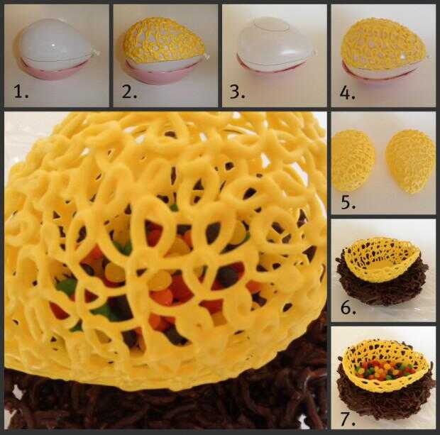 1. Volar un globo y la forma como un huevo. Trace una línea alrededor de la mitad con un marcador comestible. 2. Coloque en tazón de fuente - ocurrió entonces, tuve un cuenco de huevo en forma de usar. La pipa se derrite caramelo derretido en forma de lazo. Sólo van a medio camino abajo - a su línea. Lugar en nevera para que endurezca. 3. utilice otro balón, esta vez para la parte inferior del huevo. Dibujar otra línea en el centro y un círculo en el centro. Llene completamente el círculo de apoyo para las habas de jalea. 4. tubo más lazos alrededor del globo, en la parte superior del centro. 5. después de que los lazos son duros, con cuidado corte el extremo del globo y lentamente deje que el aire hacia fuera. Se oye un ruido crepitante como lanzamientos del balón. Y dos la mitad hacen un entero... huevo. 6. Coloque la parte inferior del huevo en su nido de chocolate. 7. Llene con gomitas! Tiempo ahora para hacer el pastel ~
