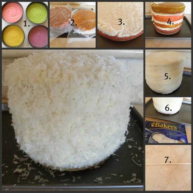1. agregado color de alimento antes de al horno cada capa de pastel ~ sí, usted probablemente descubrió esa parte. 2. congeló hasta que estaba lista a las heladas. 3. entonces yo les apilados todos, poniendo un delicioso coco relleno entre cada capa. 4. de cuatro capas, hace una torta muy alta! 5. helado afuera. 6. prensado coco alrededor de los lados y en la parte superior. 7. utiliza algunos Roces poco para ayudar a sostener el nido!