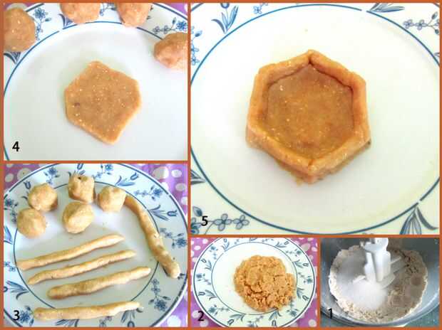 (5) - con una forma cilíndrica larga, delinear cuidadosamente y presiona a lo largo de la forma hexagonal de la masa. Al hacerlo, da una profundidad a la base de galleta. Del mismo modo hacer con la masa restante.