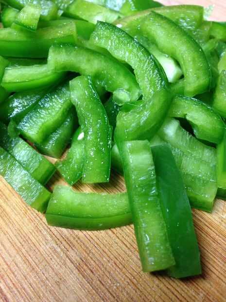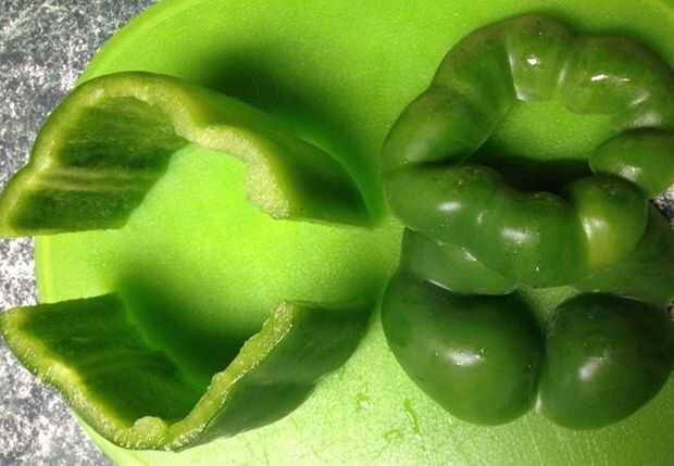 Cortar un verde / bell pepper en la mitad. Corte la parte superior había redondeado media porción de cada pimiento. Quitar las semillas, hollejo y partes de la pimienta que no son verdes. Puede cortar o trocear los pimientos, aunque las tiras de hacen una declaración hermosa en el plato terminado.