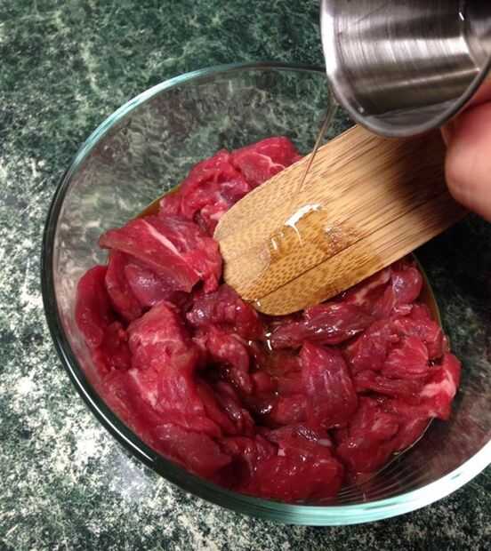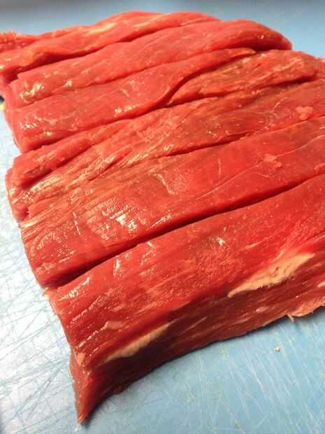 Usando una 1/2 libra pedazo de carne, rebanada de la carne de vaca con el grano en tiras de 1 a 1 ½", luego corta las tiras de 1/8 piezas. Refrigere la carne y preparando las verduras y salsas.