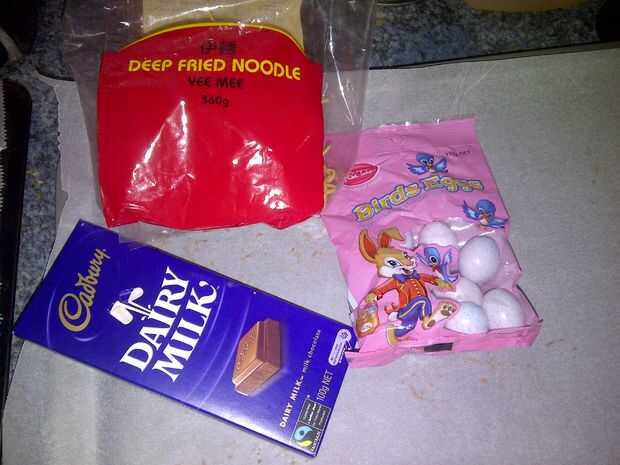 -g 360 Deep Fried noodles ('Yee me')-solo en el supermercado (coles) encontré en la sección internacional. Puede utilizar ramen instantáneo, pero no sabe tan bien, y usted debe asegurarse de que está precocido y plazo de caducidad.