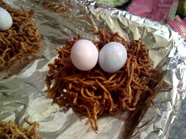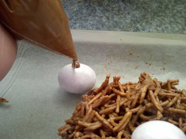 Para hacer esto, sólo fundir más chocolate y ponerla en una manga pastelera (o cheat como derrita el chocolate directamente en una bolsa zip lock y cortar la esquina) luego poner un poco de chocolate en el huevo y se usa para pegar al nido.