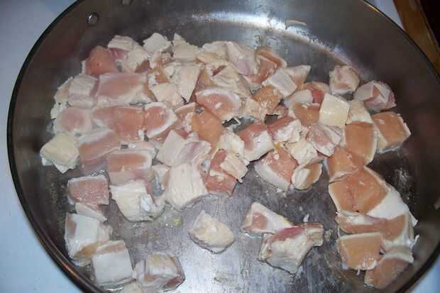 4. Desmoldar el tocino cocinado freír, dejar parte de la grasa en la sartén y añadir el pollo.