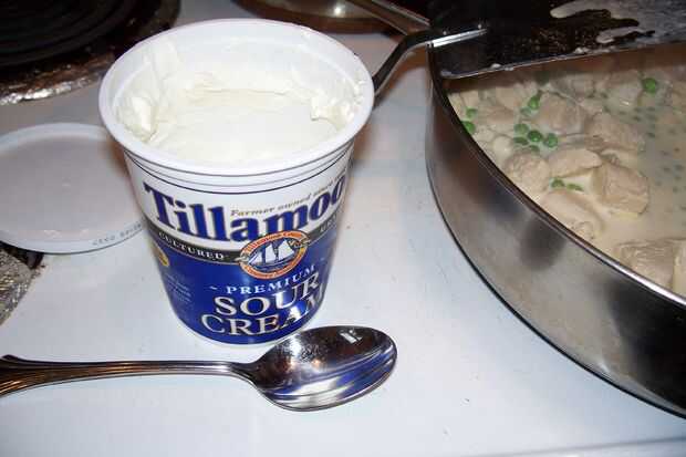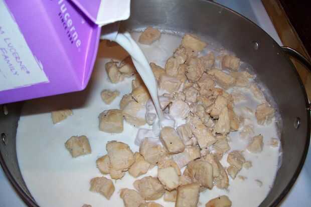 1. Añadir la media crema, crema agria (o yogur o queso crema) a pollo en la sartén, revolver y cocinar juntos durante un par de minutos hasta liso y cremoso. (salsa espesa como se refresca así que realmente no tiene que ser "espesa" cuando se hace igual combinado).