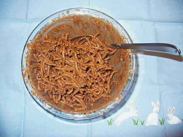 Agregue 2 tazas (que es aproximadamente 5 oz.) de fideos chow mein a la taza y revuelva suavemente hasta que están cubiertos uniformemente con la mezcla de caramelo derretido.
