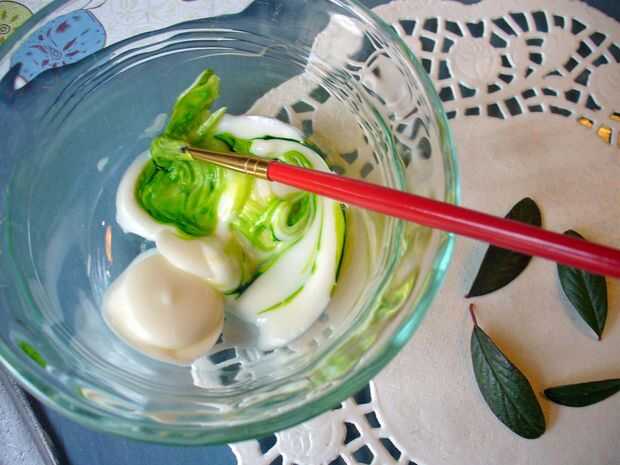 4. derretir 1/2 taza vainilla caramelo se derrite en el microondas durante 30 segundos. Revolver. Si no totalmente derretida, microondas para un adicional de 20-30 segundos hasta que derretido y suave. Añadir unas gotas de colorante verde / o colores de caramelo y remover.
