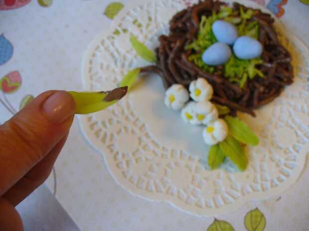 10. Retire las hojas del congelador. El fresco de la hoja de la hoja cubierto de caramelo de vainilla verde y aplique una pequeña cantidad de los restantes verde derretido o cacao caramelo en un extremo de la hoja y presione el extremo derretido suavemente en una de las ramas del nido. Repita hasta que el arreglo que más te guste.