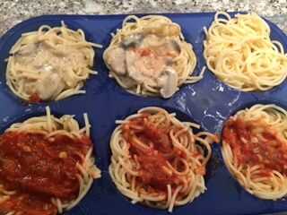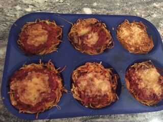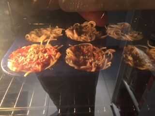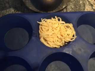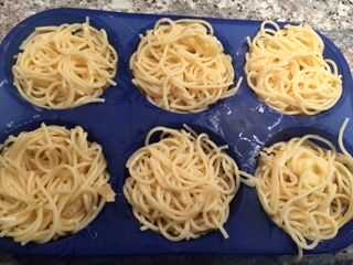 la gota en los espaguetis en cada molde y presione firmemente hacia abajo con una cuchara.