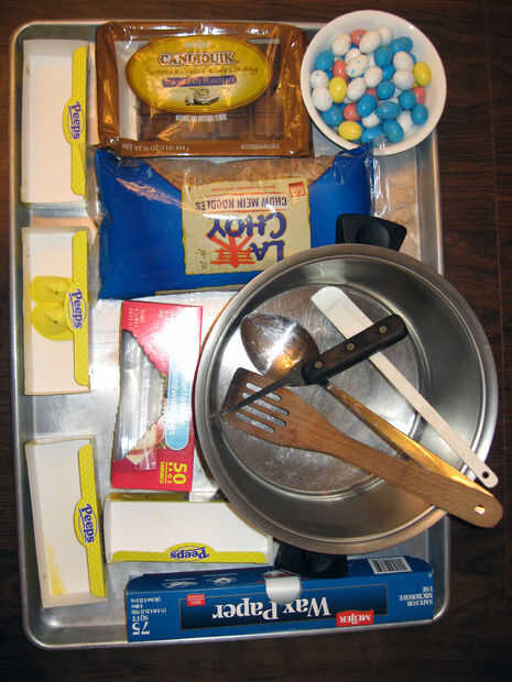 18 recoger plástico zip loc sandwich bolsas, una cacerola u olla, un largo grande maneja cuchara, una espátula pequeña, un cuchillo o cuchara y un turner de crepe o algo que es plana en la parte inferior para revolver el chocolate derretido. Encontrará también una hoja de galleta forrado con papel encerado, o simplemente poner el papel encerado sobre la mesa o encimera.