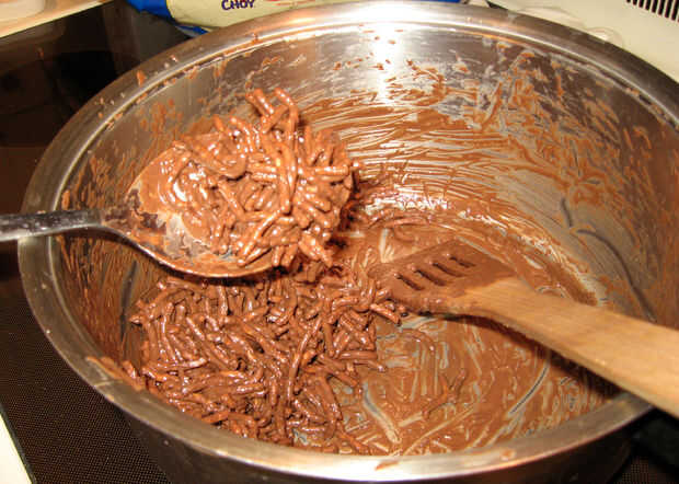 Si está utilizando bloque de chocolate, el chocolate para derretir más rápidamente, romper o cortar la manzana en trozos más pequeños. Puede utilizar regulares chips de chocolate, chips de chocolate con leche o chips con sabor también. Han escuchado de la adición de mantequilla de maní a la mezcla, pero no sé la medida requerida. Base de aceite de menta o aromatizante cereza chocolate podría ser bueno también. Fundir el chocolate a fuego bajo agitando con frecuencia con un utensilio de fondo plano teniendo cuidado de no dejarlo quemar. Cuando el chocolate se haya derretido, añadir los fideos Chow Mein. Revuelva hasta que estén totalmente recubiertos con chocolate. Caída de un grupo de 3" de lo que ahora parece ramas sobre papel encerado.