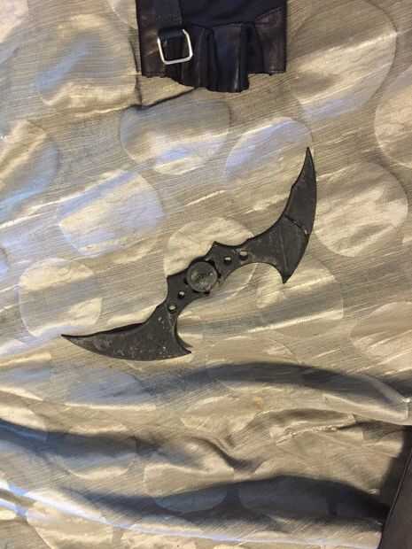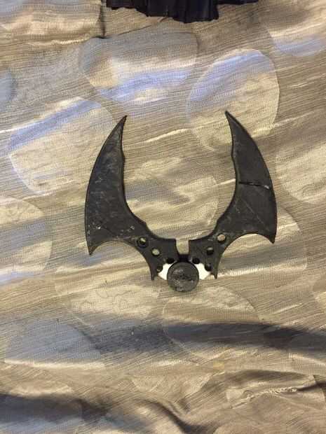 3D imprimí un batarang desde un archivo de thingiverse encontrado aquí. Se mueve y es fácil de llevar, aunque mi hijo luego decidió que no quería que se distraen de sus palos de choque. Así que se quedará en la casa durante el truco o trato.