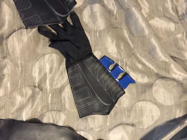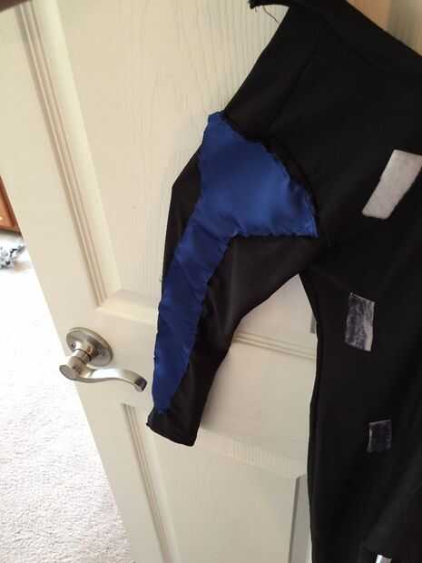 He utilizado las habilidades de costura pobre que tengo que coser rayas azules en los brazos y los hombros del traje. Compramos a algunos barato "batman" guantes y dolía los picos azules. Una versión de Nightwing tiene picos eléctricos que cuando se activa. Pensé que esto llegaría cercano, al menos para el motivo de Halloween.