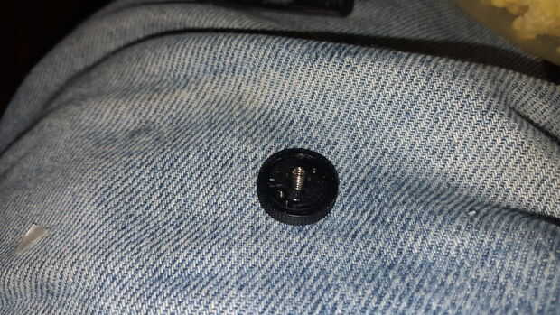 cuando el pestillo de la puerta de la batería se rompió en mi apuntar y disparar, necesitaba una solución rápida y barata. Un viaje a mi ferretería local y un par de dólares más tarde, tuve mi arreglo. El perno encajan perfectamente en el trípode, pe