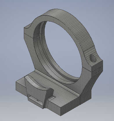 La base del Monte es el anillo externo que incorpora el T-nut. Diseñado para tomar ventaja de la utilidad de la capacidad de impresión 3-d en mi universidad técnica local, tecnología de Atenas, Atenas, GA, donde ahora estoy inscrito como estudiante. Desde que la parte final se hace del plástico del ABS extruido, sentí que sería necesario un componente metálico más importante para el montaje roscado, puesto que una rosca interior de ABS se tira hacia fuera con el tiempo. También incorporé una repisa, perfilada para la lente de Nikkor, que lleva el peso del cuerpo de la cámara sin apretar el anillo del objetivo. Para la fuerza agregada, sacó una cavidad interna, para llenarse de epoxy, para soportar la tensión a la T-nut.
