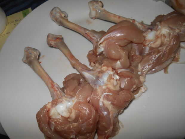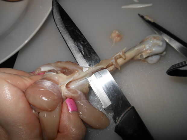 Una vez que ha pasado puede comenzar a cortar con tijeras la carne en algunos lugares para empujar hacia arriba y exponer más hueso. Girar de dentro hacia fuera de manera. Por favor recuerde en un hueso de theres realmente 2 baquetas, uno muy muy fino, usted tendrá que quitar esto sólo para estar seguro, pero su bastante fácil cortarlo hacia fuera.
